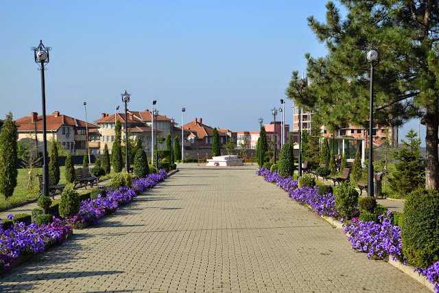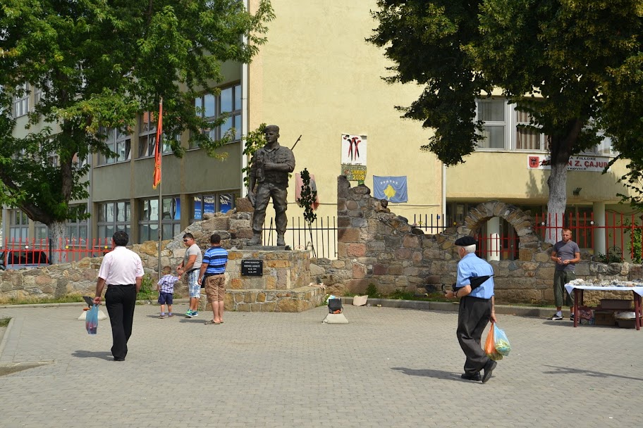 Parkuję po stronie albańskiej, przy głównej drodze - znaki parkingu są tylko dla dekoracji 😉. Wokół nowe i budowane budynki, typowy bałkański bałagan, albańskie flagi - nie mogło zabraknąć też pomnika UCK.