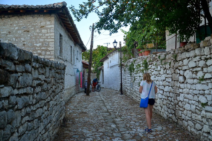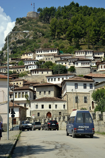 Po rozłożeniu namiotu dojeżdżamy w końcu do Beratu. Parkuję w centrum i gramolimy się po cholernie śliskim bruku na górę, do twierdzy.