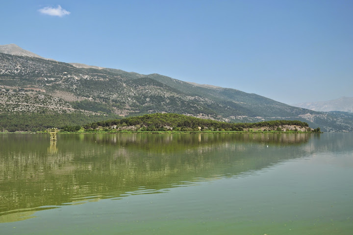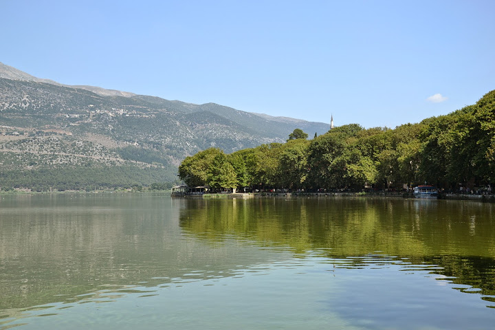 Na jeziorze znajduje się wyspa o tej samej nazwie co miasto - związana jest z przywoływanym już kilkukrotnie Ali Paszą z Tepeleny. To właśnie tutaj Ali umieścił stolicę swojego władztwa, teoretycznie lennego wobec Stambułu, a faktycznie niezależnego (samodzielnie utrzymywał stosunki dyplomatyczne np. z Napoleonem). W końcu sułtan się wkurzył i nakazał Alego zabić. Kule dopadły go w klasztorze na widocznej wyspie, gdzie dzisiaj można dotrzeć statkami turystycznymi.