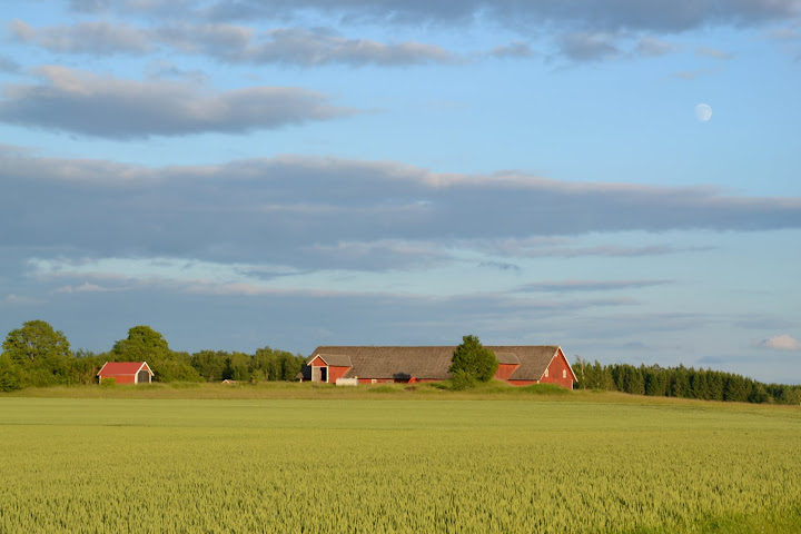 Wieczór znowu jest ładniejszy niż poranek (to w Skandynawii częste zjawisko), więc co chwilę zatrzymuję się, aby sfotografować zagubione wśród pól przysiółki.