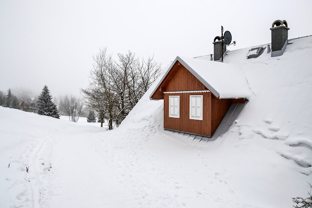 Chmury, chmury i chmury. Ale to nic - iść trzeba. Chcemy dzisiaj przejść przez Śnieżkę, a że na widoki szans nie ma, to wybieramy krótki żółty szlak po czeskiej stronie. Początkowo mija on kilka podsypanych domów, następnie wchodzi w las.