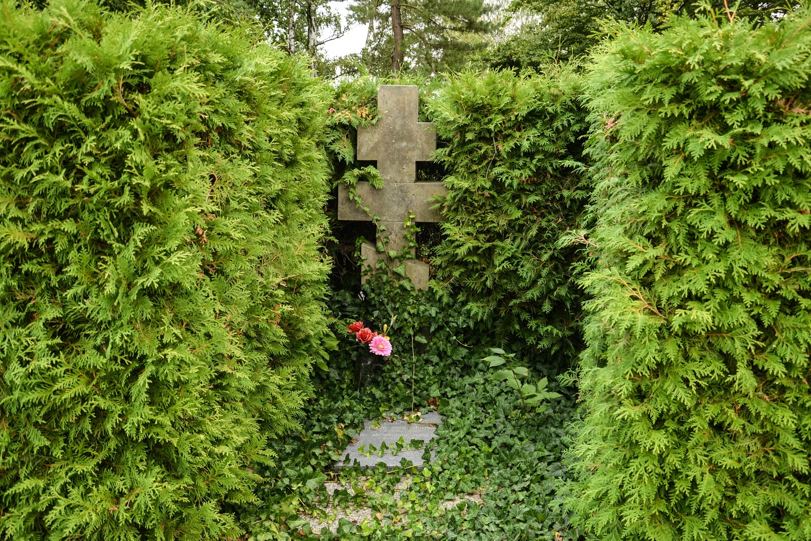 Za żywopłotem kwatera wojenna Wehrmachtu w formie wielkiego trawnika z charakterystycznymi krzyżami.