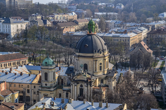 We wschodniej części starówki należy zerknąć na kościół dominikanów, dzisiaj greckokatolicką cerkiew Najświętszej Eucharystii (Церква Пресвятої Євхаристії). To kolejny cenny barokowy zabytek i kolejny, który bardzo trudno objąć aparatem.