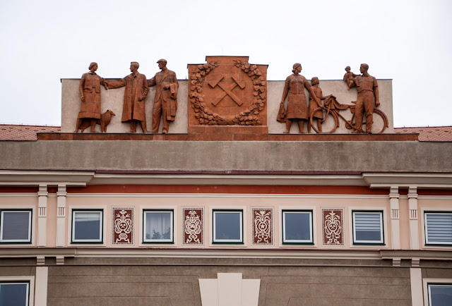 Większa dziura posiada na dachu kompozycję rzeźbiarską z tematyką z epoki (robotnicy wracają do domów). Pomarańczowe domy w tle to tzw. dwouletky, najstarsze budynki